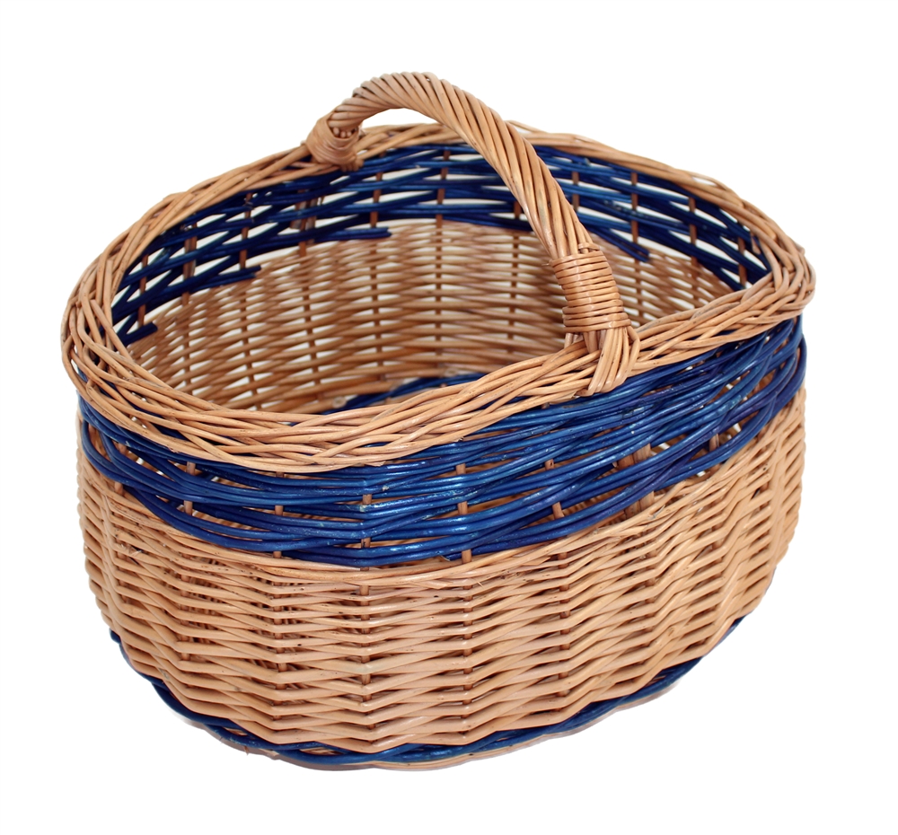 Der Korb bietet viele Vorteile beim Einkauf. Der beite Boden gibt dem Korb Standfestigkeit und Stabilität und der flache Tragebügel ermöglicht einen einfachen Transport. Die blauen Steifen lockern den gleichmäßig und schön geflochtenen Korb auf.